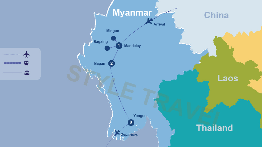 Visite o Pagode Mahamuni, o Pagode Kyauktawgyi, uma grande imagem de Buda esculpida num único bloco de mármore, o Mosteiro Shwenandaw, famoso pelas suas requintadas esculturas em madeira, o Pagode Kuthodaw, conhecido como o maior livro do mundo pelas suas lajes de pedra com escrituras budistas, e o Palácio Mandalay. Depois, prossiga para Bagan.