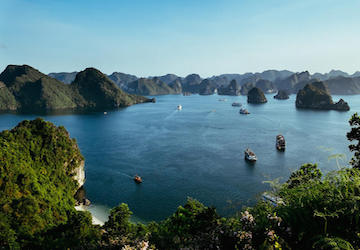 Depart for Halong Bay. Upon arrival, embark on a cruise and start cruising around the bay to see the amazing karts with different formations and then stop for a walk through the Amazing cave. There will be plenty of time for kayaking, swimming and sunbathing after the cruise anchors at a clean calm sea. Enjoy a wonderful sunset dinner and overnight on the cruise.