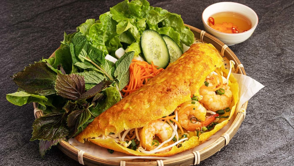 Os vietnamitas apreciam a iguaria nativa conhecida como Banh Xeo, ou panqueca em inglês. Os cozinheiros locais preparam geralmente o Banh Xeo em poucos minutos. Numa panela com óleo aquecido, coloca-se uma camada fina de massa feita com farinha de arroz, água e cúrcuma. Em seguida, adiciona-se à massa uma combinação de barriga de porco finamente fatiada, camarão, cebola e rebentos de feijão. Após alguns minutos de cozedura, dobre ao meio e cubra com folhas de alface e molho de peixe com pimenta doce. Depois pode saborear com o vegetariano verde e o molho especial.