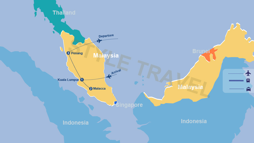 Partindo de Kuala Lumpur. No caminho, visite o famoso Templo da Gruta Kek Lok Tong para aprender sobre as crenças budistas, taoístas e confucionistas em Ipoh, no estado de Perak, famoso pelas suas minas de estanho, templos em grutas e palácios reais. De seguida, visita à Ilha Bukit Merah Orang Utan. Irá fazer um passeio de barco de 10 minutos pelo lago até à Ilha Orang Utan. Embarque numa viagem de 100 metros por um túnel de gaiola de aço para observar os orangotangos no seu exuberante habitat, testemunhando as suas interações com o meio ambiente e entre si. Atravesse a impressionante ponte de 13,5 km de comprimento para chegar a Penang, conhecida como a "Pérola do Oriente".