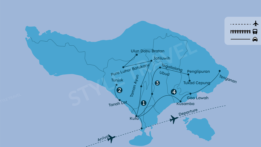 Transfer para visitar o Templo Taman Ayun na aldeia Mengwi. De seguida, visita o Jatiluwih Rice Terrace, o Pura Luhur Batukaru e o Ulun Danu Bratan Temple. Pernoite em Kuta.