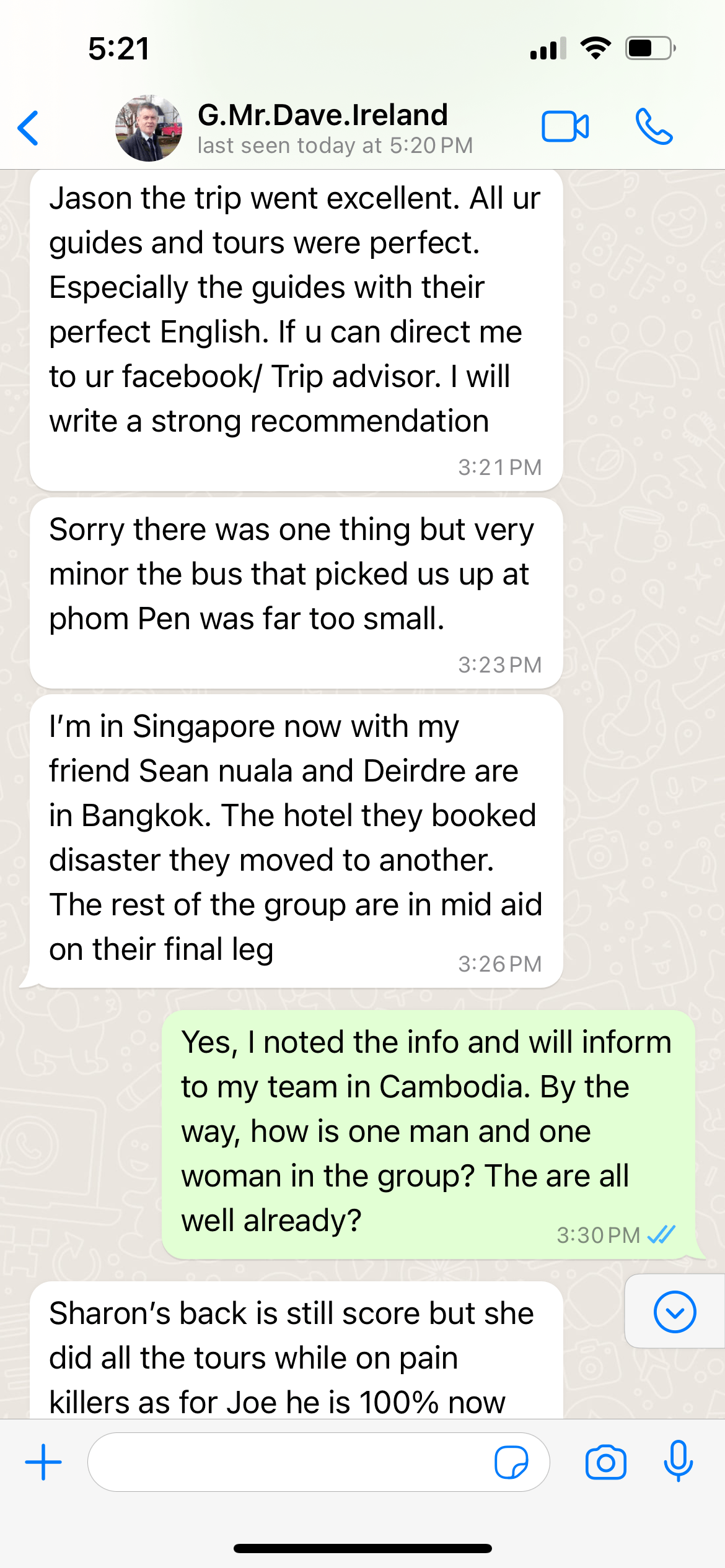 Customer: Mr. Dave and Party Country: Ireland Tour Name: Highlights of Vietnam & Cambodia