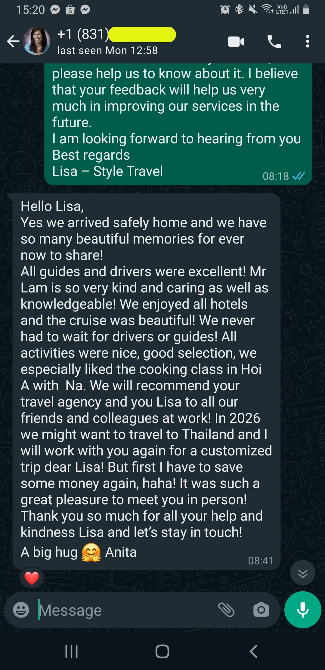 Customer: Mrs. Parul & Group Country: US, Canada & UK Tour Name: Vietnam & Cambodia Tour Each destination was well covered. Lisa worked with me...