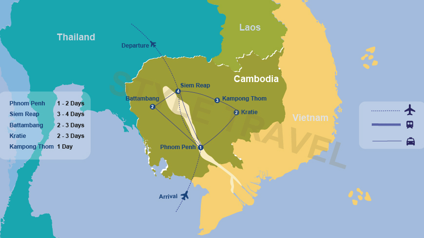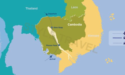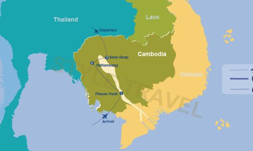 A primeira paragem na sua viagem por este país é Phnom Penh, a capital do Camboja e local de palácios e pagodes espetaculares. Após passar um ou dois dias aqui, você segue para três ou quatro dias em Siem Reap, que serve como porta de entrada para o complexo de Angkor Wat. A sua viagem terminará no Lago Tonlé Sap, o maior lago de água doce do Sudeste Asiático.