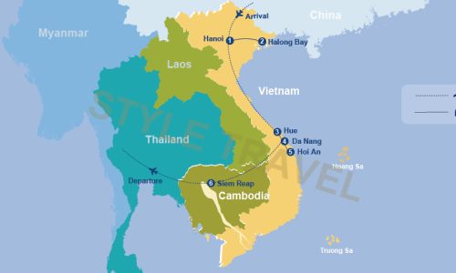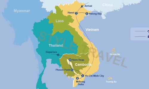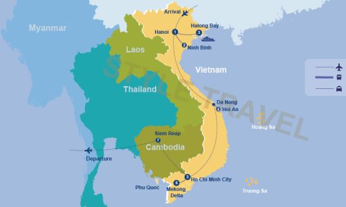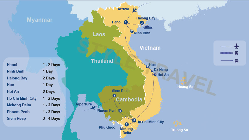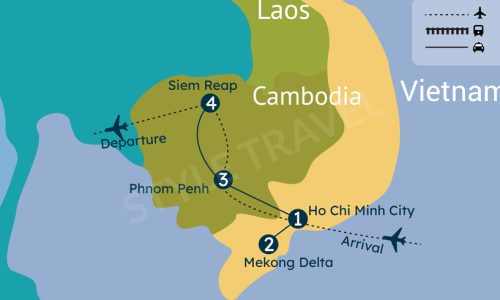 A sua viagem ao Vietname e ao Camboja deverá começar com a aterragem no aeroporto de Hanói (Vietname). Depois de passar cerca de 3 a 4 dias a visitar Hanói e a Baía de Halong, irá apanhar um voo para o centro do Vietname, onde passará cerca de 3 a 4 dias para visitar Hue, Da Nang e Hoian. Depois, continua-se a voar para o sul do Vietname e visita-se Saigão e o Delta do Mekong durante cerca de 3 dias. Do sul do Vietname, terá 3 opções para se mudar para o Camboja: