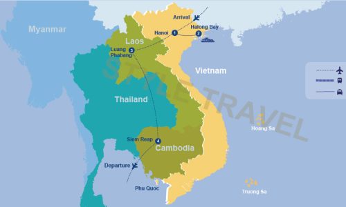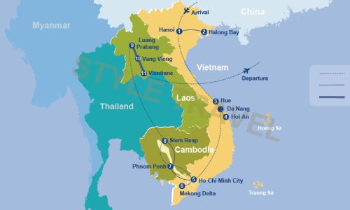 A sua viagem terá início em Hanói, o centro político, económico e cultural do Vietname. De seguida, passará dois dias na Baía de Halong, Património Mundial da UNESCO. Para continuar, irá apanhar um voo para Hue e Hoi An, que têm 1.500 anos de herança. Depois disso, chegará à Cidade de Ho Chi Minh, o espírito inventivo do Vietname moderno, e ao Delta do Mekong, com um rico passado vietnamita através dos seus movimentados mercados flutuantes. De seguida, irá apanhar um autocarro/voo para Phnom Penh, a capital do Camboja e lar de magníficos palácios e pagodes, e o próximo destino será Siem Reap, a porta de entrada para o complexo de Angkor. O local final desta viagem é Luang Prabang (Laos) - Património Mundial da UNESCO com um centro histórico preservado.