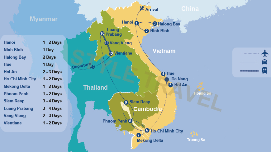 Numa viagem curta de apenas 10 dias, pode visitar 1 ou 2 locais em cada país: Hanói e Baía de Halong no Vietname, Siem Reap no Cambodja e Luang Prabang no Laos. Se tiver mais 6 ou 7 dias, pode considerar visitar Hoi An, a Cidade de Ho Chi Minh, o Delta do Mekong no Vietname e Phnom Penh no Camboja. No caso de ter mais de 18 dias, terá tempo suficiente para adicionar Vientiane, Luang Prabang, no Laos à sua viagem.